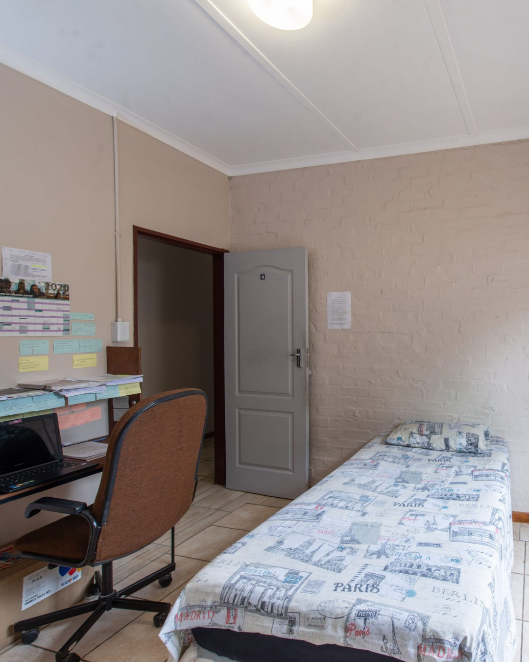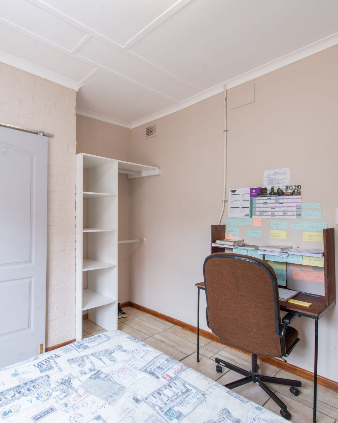 Single bed with mattress, study desk and chair, wardrobe.